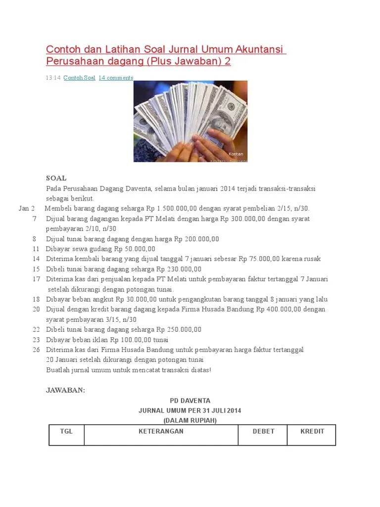Menyelesaikan soal jurnal umum pada mata pelajaran praktikum akuntansi. Minta soal dan pembahasannya dong untum perusahaan dagang mulai dri jurnal umum buku besar neraca saldo dll kalo bisa lengkap. Contoh jurnal umum, pengertian jurnal umum, & contoh soal jurnal umum. Demikianlah tadi 34 transaksi contoh jurnal umum dan jawabannya. Yuk baca artikel dari gramedia.